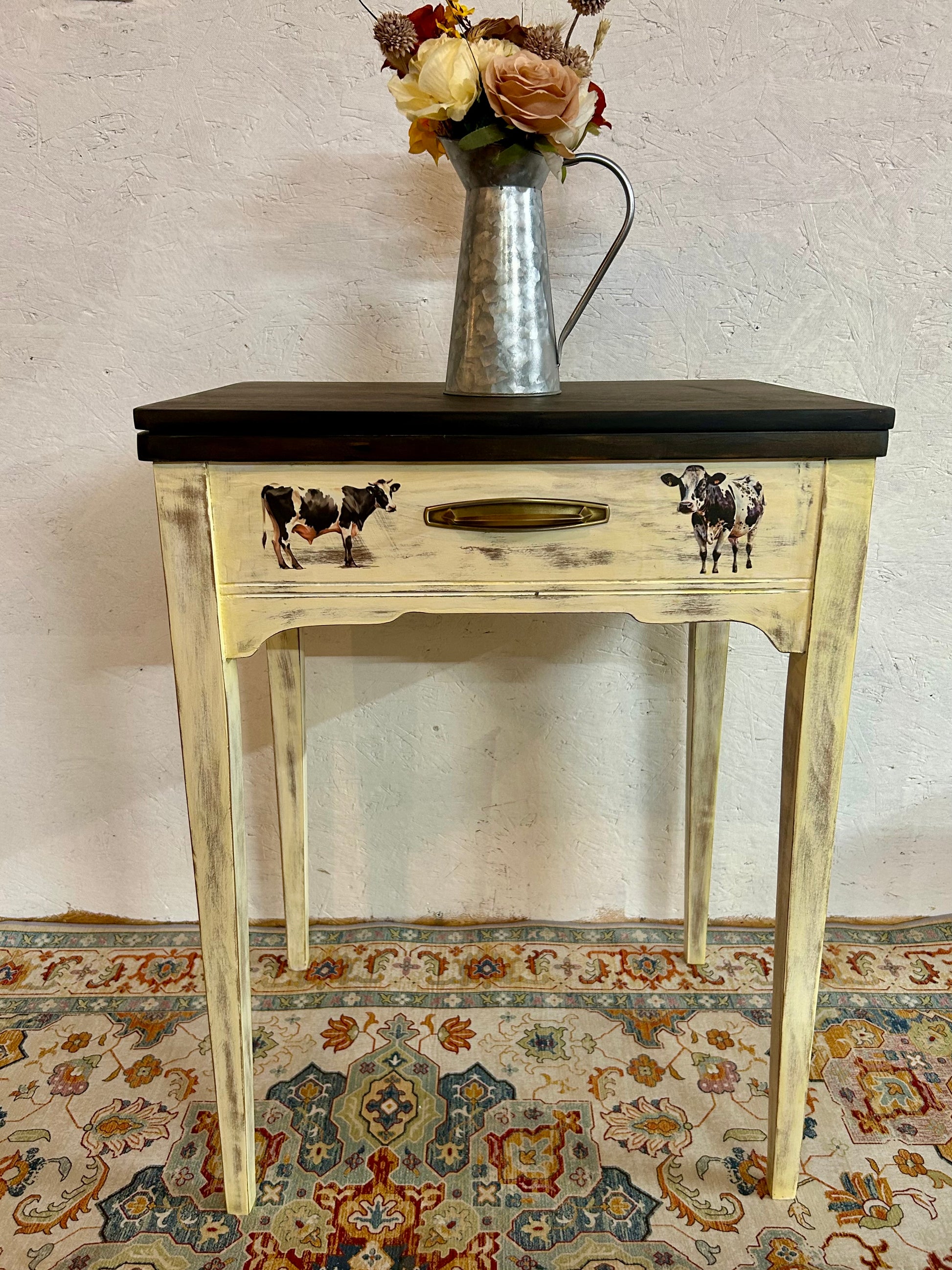 This one-of-a-kind farmhouse side table began its life as an antique sewing table and has been lovingly reimagined into a charming accent piece. The creamy distressed finish, paired with adorable Holstein cow prints and a deep walnut-stained top, brings rustic warmth and character to any space.