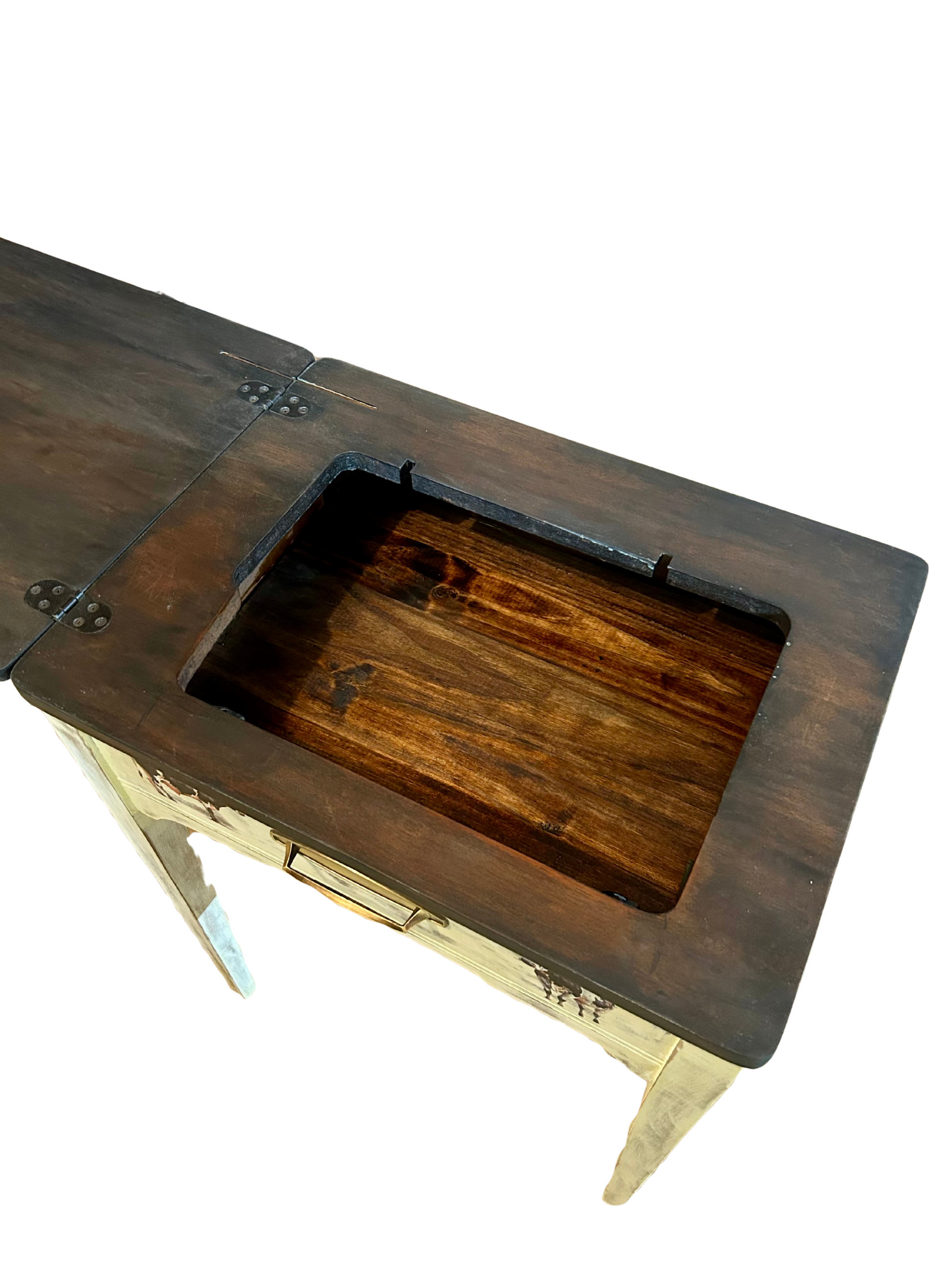 The hinged flip-top opens to reveal a hidden storage compartment. The original sewing machine cutout is still preserved underneath, but we’ve carefully built it into a functional storage space — blending vintage history with everyday usability.