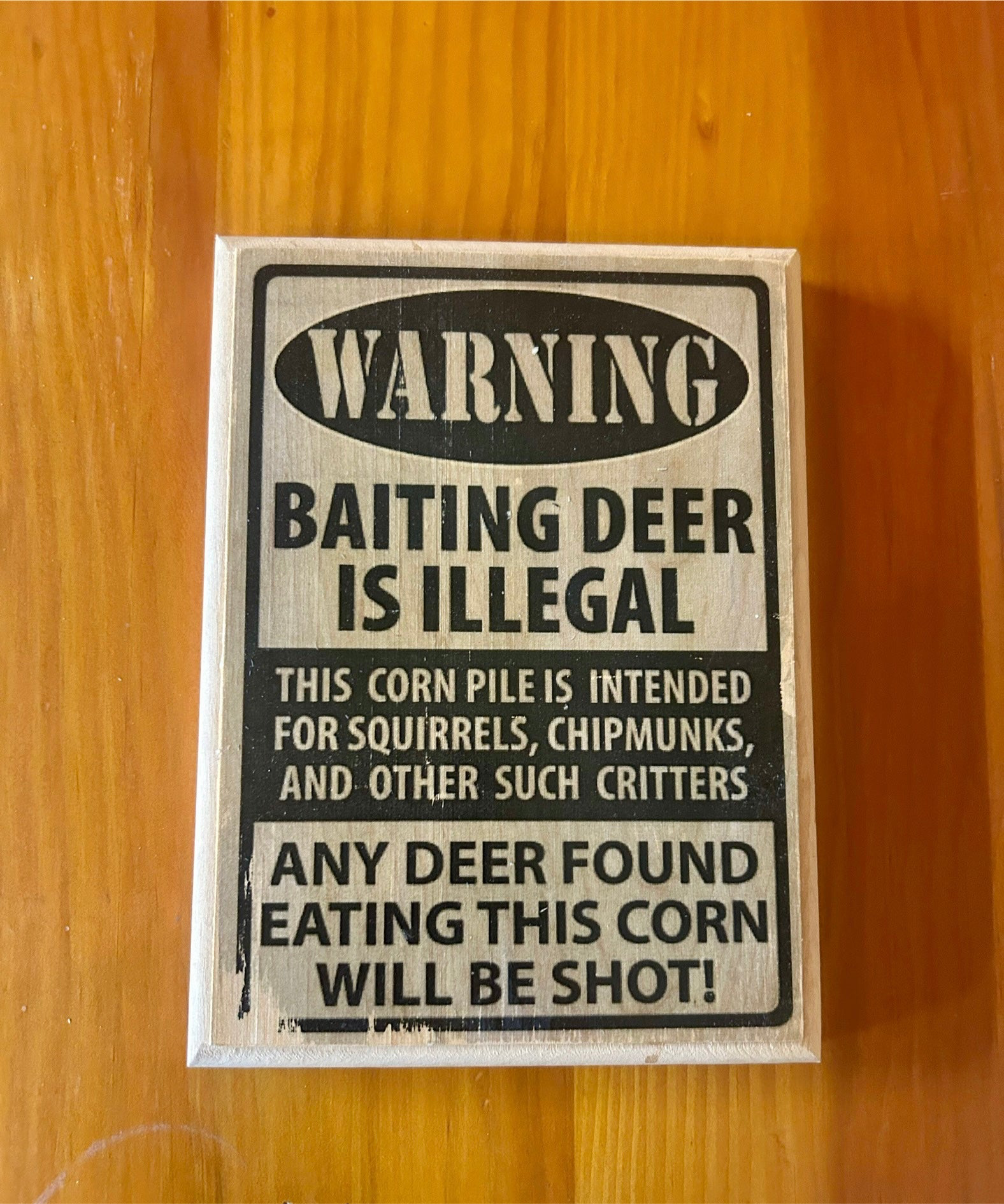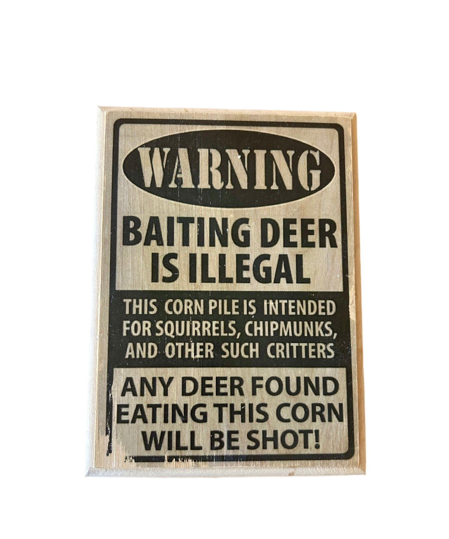 This sign is a great gift for the hunter in your life. Sign reads: Baiting deer is illegal. The corn pile is intended for squirrels, chipmunks, and other such critters. Any deer found eating this corn will be shot!”
