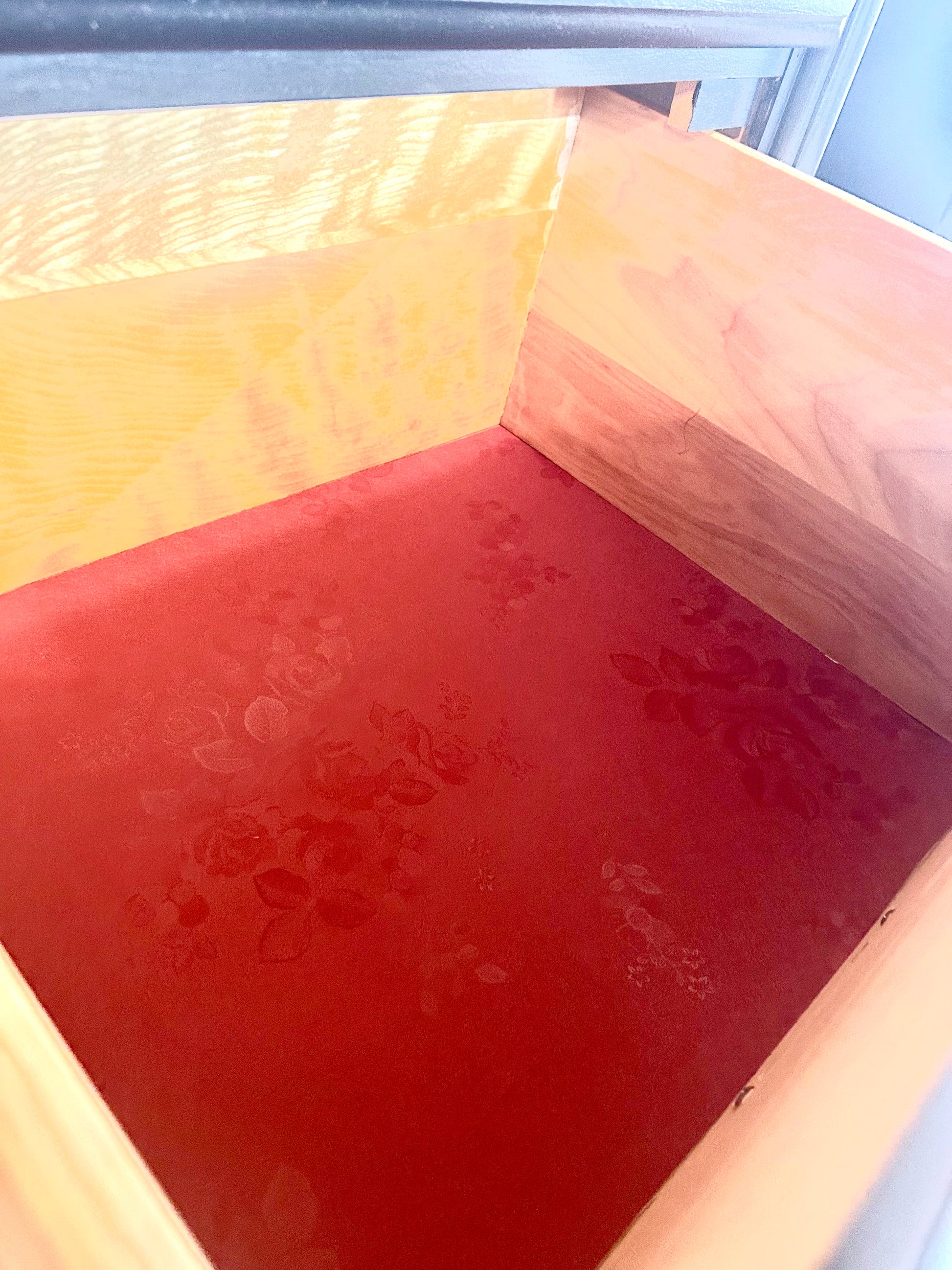Each nightstand features three spacious drawers, updated with sleek silver hardware for a modern touch. Inside, you’ll find a bold pop of red — the drawers are fully lined with rose-embossed red liners for a hidden bit of elegance you’ll love every time you open them.