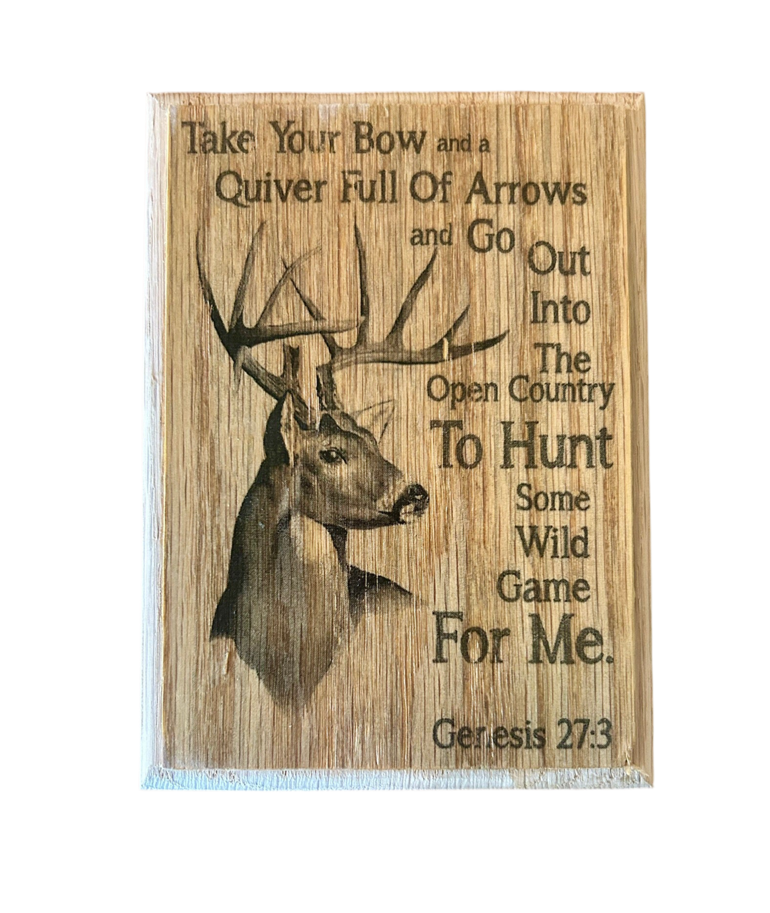 Sign reads: Take your bow and a quiver full of arrows and go out into the open country to hunt some wild game for me.
